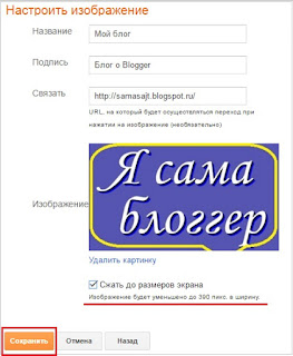 Если Вы не помните ширины боковой колонки Вашего блога - гаджет Вам сам напомнит и предложит уменьшить (сжать до размеров экрана) баннер в ширину.