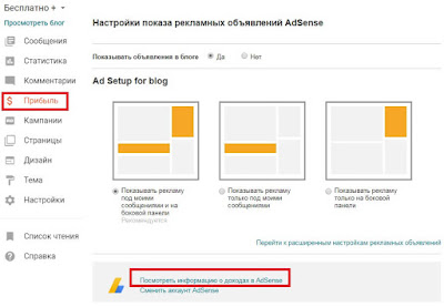 5. На следующем шаге Вам откроются настройки блога Blogger - пункт меню "Прибыль".